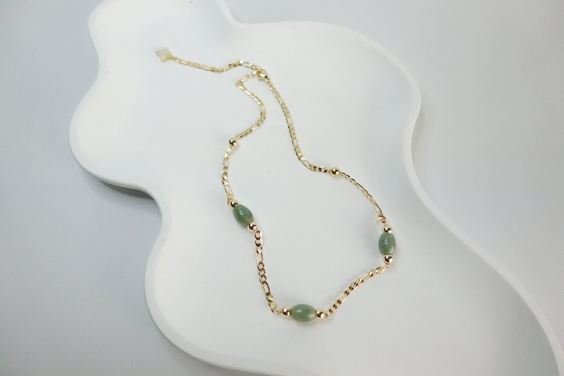 The Jade Choker Necklace is a refined statement piece designed to sit gracefully at the collarbone. Featuring polished natural jade beads, each necklace showcases subtle variations in color and translucency—ranging from soft milky tones to gentle green hues—making every choker truly one of a kind.